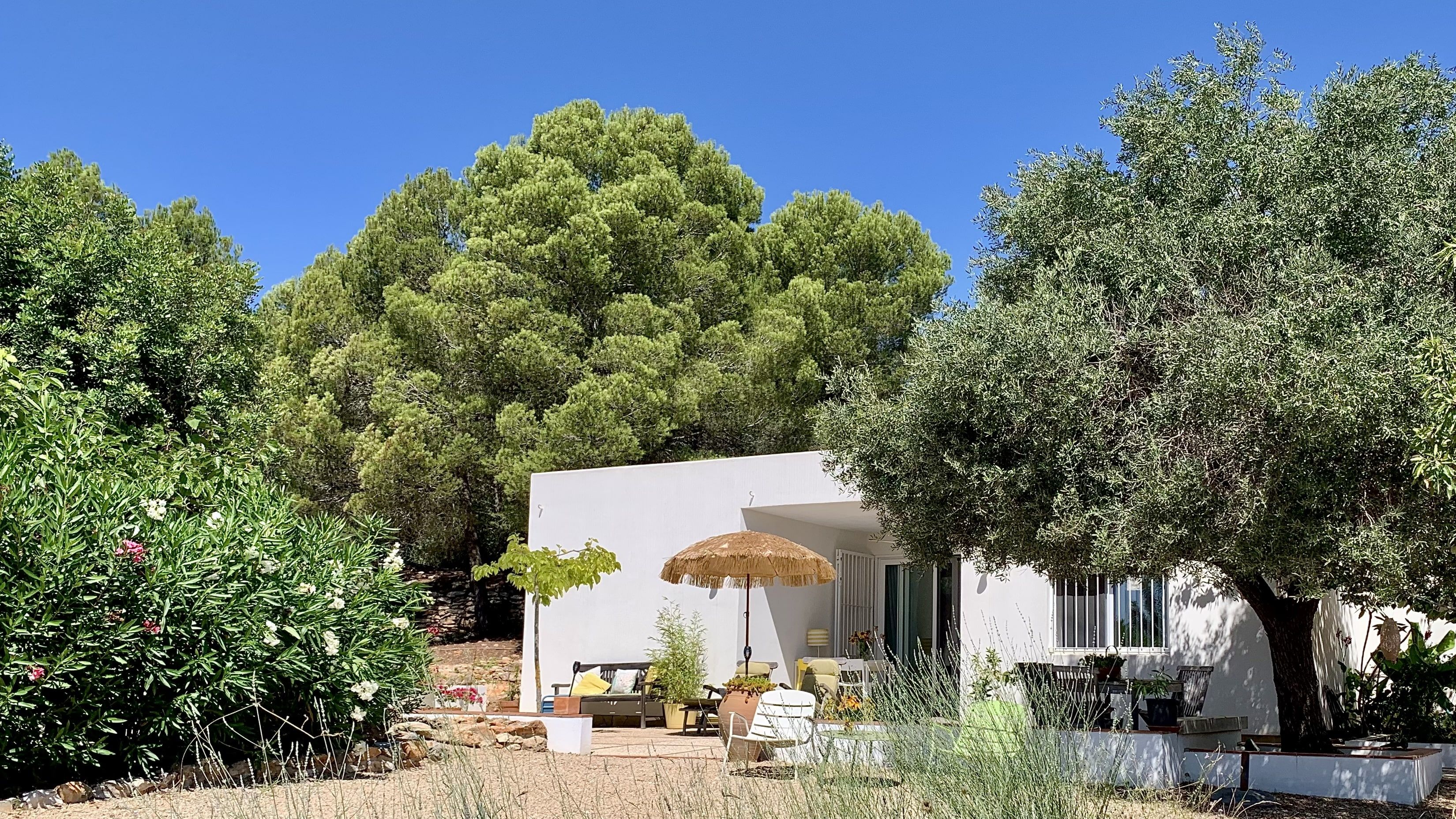 Voor het huis ligt een groot zonneterras, dat direct toegang biedt tot het zwembad. Bij het zwembad bevindt zich "La Cabana", een schaduwrijke plek met een comfortabele bank, een zitje en een eettafel, perfect om te ontspannen met een boek of om te genieten van een siësta in de schaduw. Bovendien is er een royale hangmat onder een olijfboom die uitnodigt tot ontspanning.